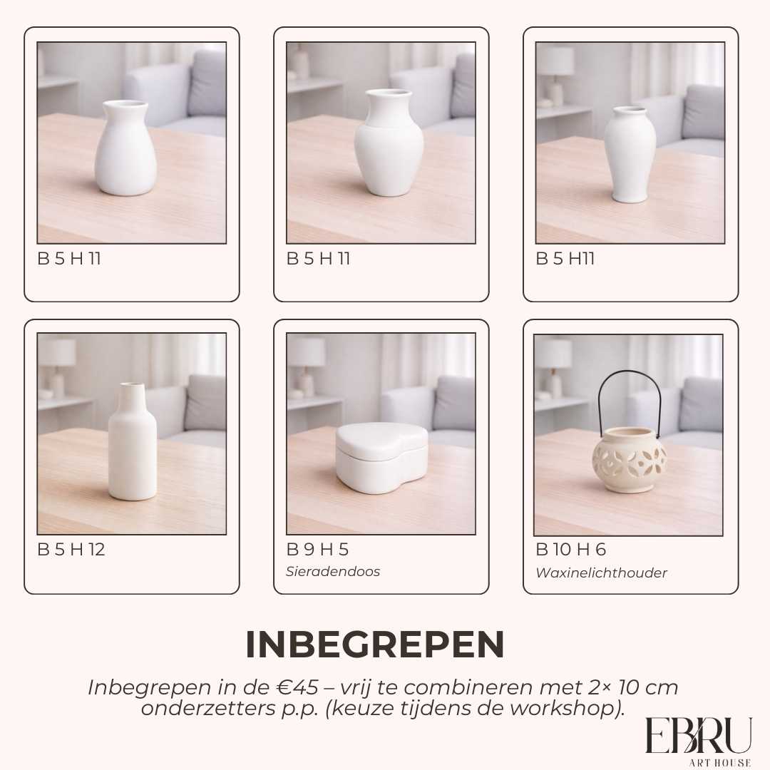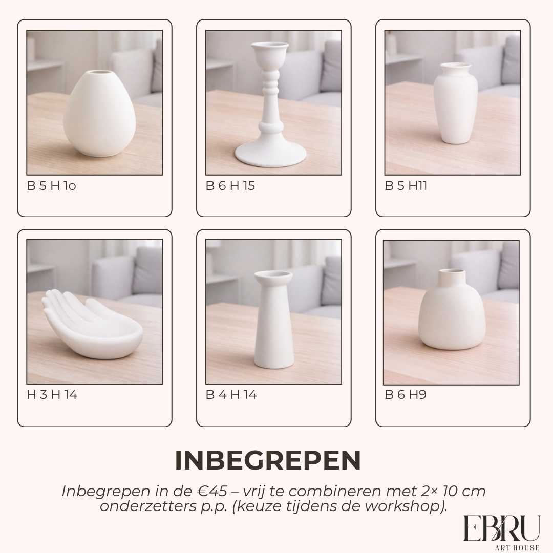 Inbegrepen bij de basisprijs zijn 2 onderzetters en 1 vaas (±12 cm).Tijdens de workshop kun je daarnaast kiezen uit ongeveer 30 extra keramiekmodellen.