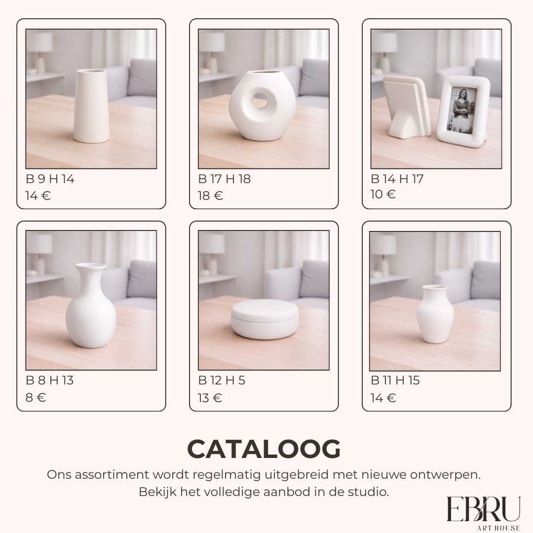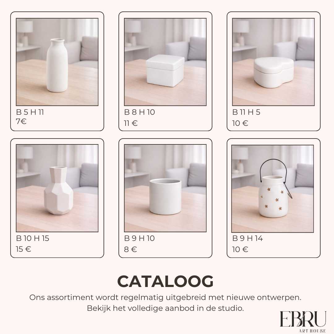 Kies je keramiekstuk: vazen, onderzetters en sieradendoosjes in meer dan 30 modellen en afmetingen.