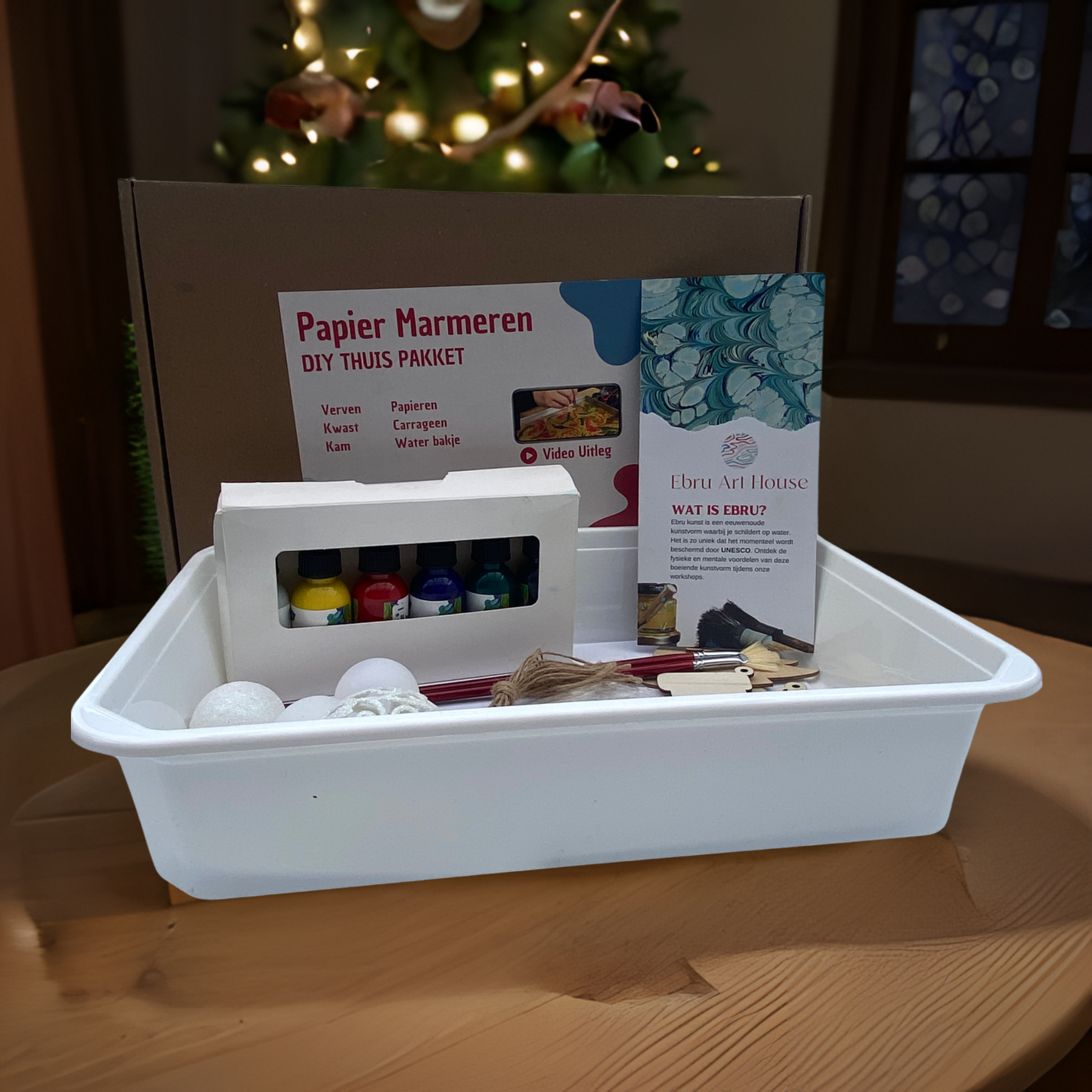 Deze kersteditie bevat alle materialen, inclusief speciale marmerverf die geschikt is voor alle oppervlakken zoals plastic, stof, hout, papier, keramiek en steen.